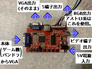 ビデオ(RCA端子)、S端子、RGB(15Khz)で出力します。