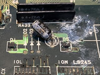 基板に戻って更に右側...これもコンデンサ膨れてる感じ。
