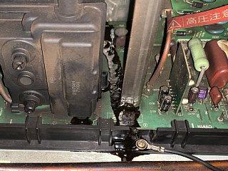 付近のコンデンサが破裂していることもあり、