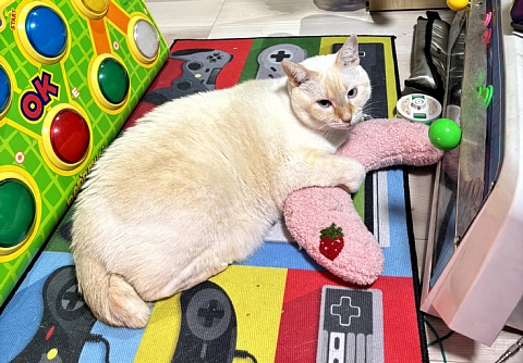 このピンクの枕(?)ちゃんと咥えて持って来てそこで寝る。