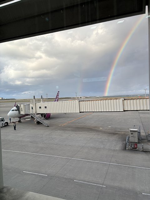 出発前の那覇空港、乗り込む機体の後ろに...