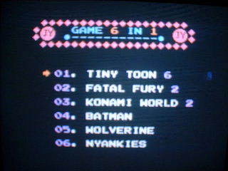 1.TINY TOON6(TINY TOONのタイトル描き換え) 2.餓狼伝説SPECIAL (パチモノ) 3.コナミワイワイワールド2 4.バットマン 5.WOLVERINE(NES) 6.ニューヨークニャンキーズ